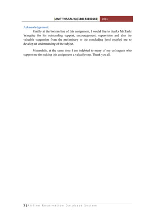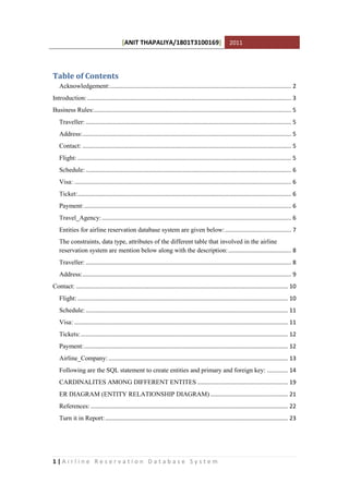 The document describes an airline reservation database system. It includes entities like traveller, address, contact, flight, schedule, visa, tickets, and payment. It provides the attributes and data types for each entity. It also includes the relationships between entities, SQL statements to create the database structure, and an ER diagram showing the relationships. The purpose is to design a database system to store and retrieve reservation information to help airline companies and customers.