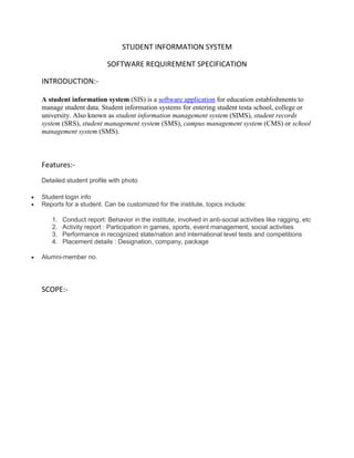 The document outlines the key features and scope of a student information system including managing student data, profiles with photos, login information, customized reports on student conduct, activities, performance and placement details. It allows schools and universities to track students from enrollment through alumni status.