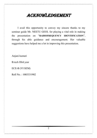 This document is a seminar report on radio frequency identification (RFID) technology submitted by Anjani Kumari for her Bachelor of Technology degree. The report includes an introduction to RFID technology, its components, types of tags, applications and advantages/disadvantages. It provides a high-level overview of the history and basic workings of RFID systems and discusses current and potential future uses in areas like supply chain management, manufacturing, and retail.