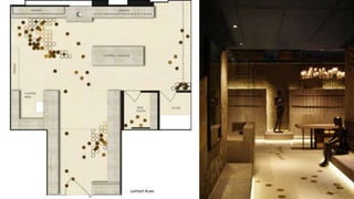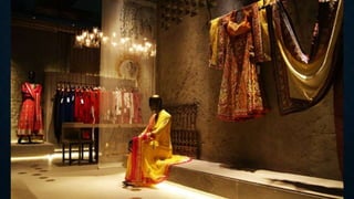 The document discusses visual merchandising and window displays for Indian fashion designer Anju Modi. It describes how Modi draws inspiration from Indian textiles and crafts to create modern designs. Her flagship store in DLF Emporio was designed by Studio Incept to complement her aesthetic. The store features materials like weathered stone and textured indigo walls. Modi's window displays have a minimalist approach, using colors from her palettes and a single seated mannequin to showcase her designs.