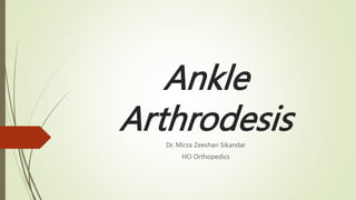 This document discusses ankle arthrodesis, which refers to the surgical fusion of bones in the ankle joint. The diseased cartilage is removed, the bone ends are cut off and fused together with internal fixation to relieve pain while restricting joint movement. Ankle arthrodesis is commonly performed for end-stage ankle arthritis. There are different types including subtalar, pantalar, and triple arthrodesis, which fuse different ankle and foot joints. Complications can include nonunion, nerve injuries, and adjacent hindfoot arthritis. Total ankle replacement is an alternative but ankle arthrodesis remains the preferred treatment for ankle arthritis.