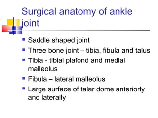 This document provides an overview of ankle injuries, including:
