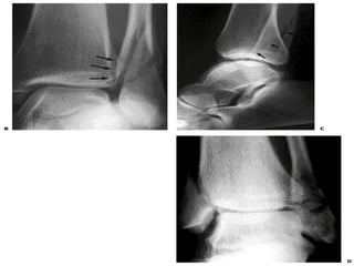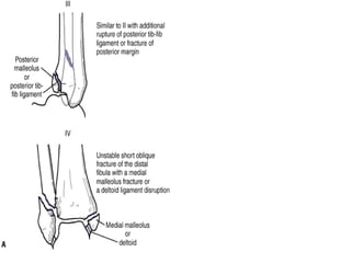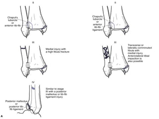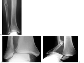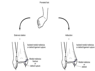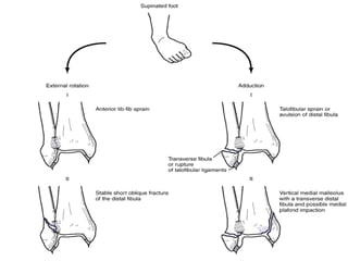 3. Guidelines for evaluating and diagnosing ankle injuries through history, physical exam, and imaging like x-rays. Classification systems for fractures like Lauge-Hansen and Weber are discussed.