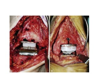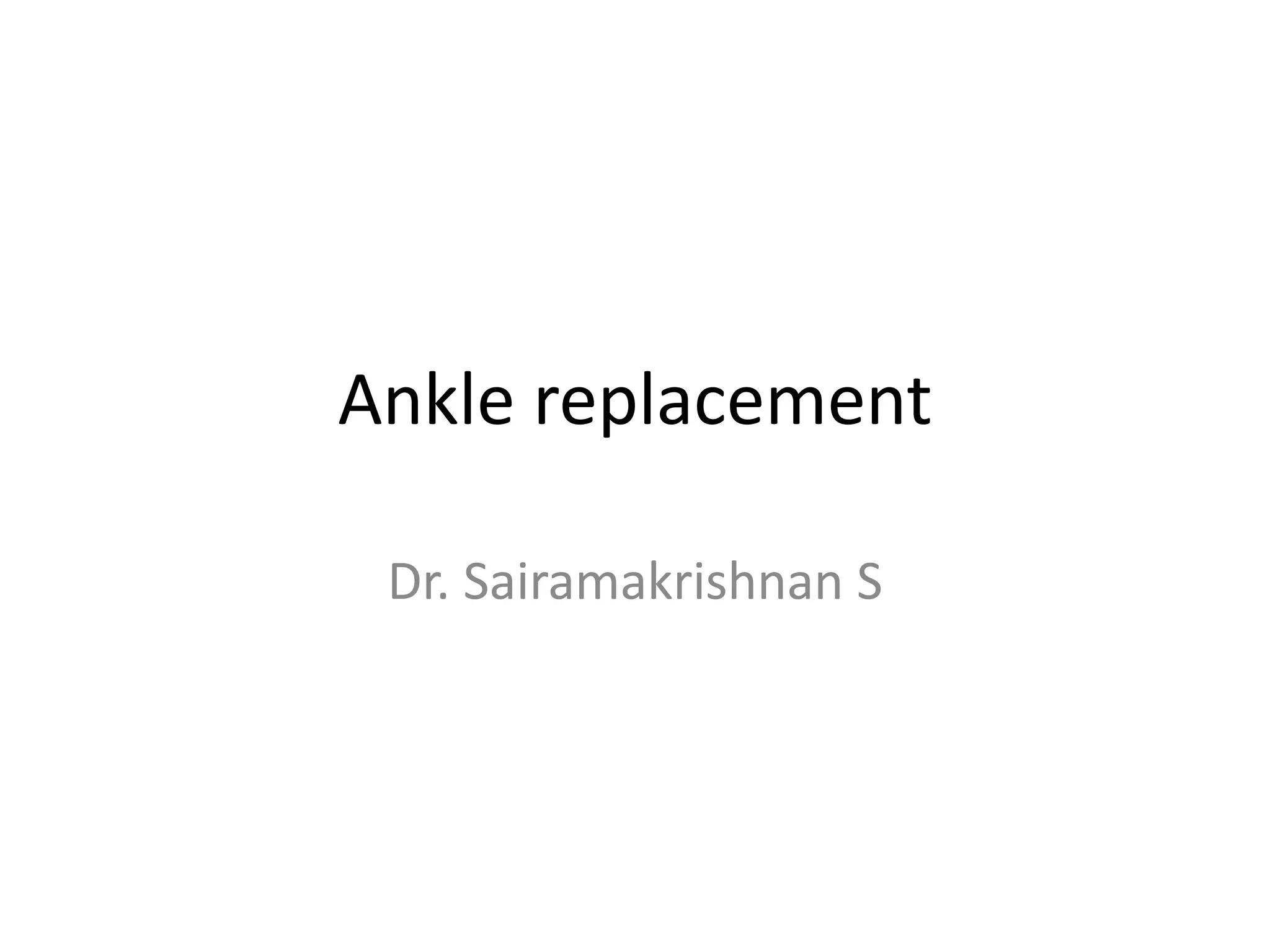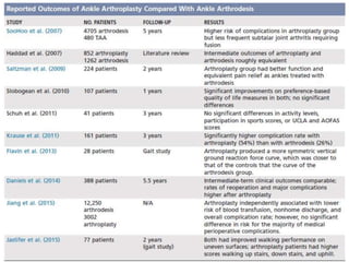 This document discusses the history and design of ankle replacement implants. It describes the evolution from first-generation constrained implants requiring extensive bone resection to current third-generation semi-constrained implants with three components. Fixed-bearing and mobile-bearing designs are compared, along with factors in determining candidacy, surgical technique, outcomes, and complications of total ankle replacement.