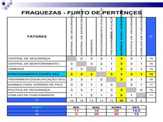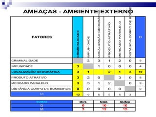 O documento apresenta um plano tático de segurança para o Centro Empresarial de São Paulo, com 12 fases: identificação de perigos, fatores de risco, diagnóstico SWOT, matriz de impacto cruzado, probabilidade, impacto no negócio, vulnerabilidade, soluções, plano de ação, controle PDCA, justificativa e conclusão. O objetivo é identificar e tratar riscos que prejudiquem o crescimento sustentável da organização de forma econômica.