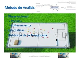 Fútbol Consulting ofrece servicios de análisis de rivales que incluyen observación de partidos y entrenamientos, recolección de estadísticas e historiales, y estudios específicos de táctica, estrategia, estado físico, estado psicológico, desempeño individual, terreno de juego y público, fortalezas y debilidades, y recomendaciones para ganar. El objetivo es ayudar a los clientes a reducir costos y obtener una amplia información para diseñar mejores planes de partido y gan