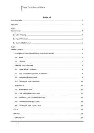 Teori Central Place Christaller dan Losch membahas distribusi pusat-pusat permukiman dalam ruang dengan mempertimbangkan faktor range dan threshold. Teori ini menjelaskan pola pembentukan hierarki permukiman berdasarkan tingkat layanan yang ditawarkan."