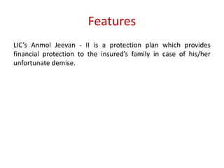 This document summarizes the features of LIC's Anmol Jeevan - II plan. It is a term life insurance plan that provides a death benefit to the insured's family if death occurs during the policy term. The plan offers a sum assured if death occurs, but no maturity benefit is paid if the insured survives to the end of the policy term. Eligibility includes a minimum entry age of 18, maximum term of 25 years, and minimum sum assured of Rs. 6,00,000. The plan allows revival within 2 years if premiums are unpaid and includes a 15-day free look period.