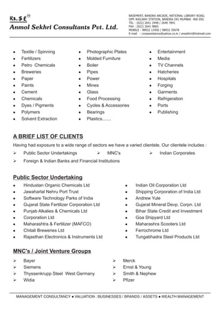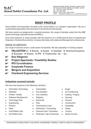 Anmol Sekhri and Associates is a valuation firm founded by Mr. Anmol Sekhri. They provide valuation services for businesses, brands, assets, and other intangible assets across many industries. Their team includes professionals from various fields like engineering, finance, and management. In addition to valuation work, they also offer services like due diligence, project appraisals, mergers and acquisitions support, and corporate finance advice. They have a diverse client portfolio including public sector companies, multinational corporations, and large Indian corporate groups.