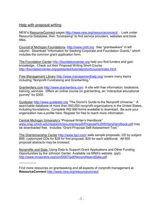 This document provides an overview of selected web resources for grantseeking and proposal writing. It lists several key websites for finding funding opportunities such as Grants.gov, the Foundation Directory Online, and the Foundation Center. It also provides resources for learning about the grantseeking process and proposal writing, including websites like Grantwriters.com, the Free Management Library, and guides from the Council of Michigan Foundations, Central Michigan University, and The Grantsmanship Center. The document recommends ResourceConnect as a starting point for all information needs related to fundraising and grantwriting.