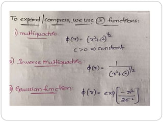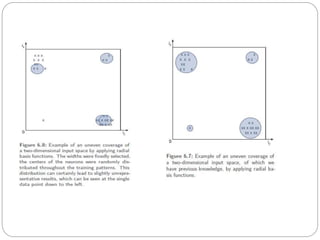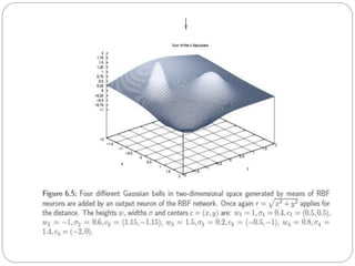 - Training an RBF network involves determining the center points, widths of the activation functions, and weights to minimize error between network outputs and targets.