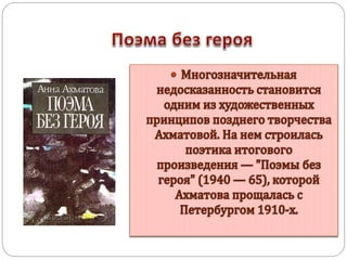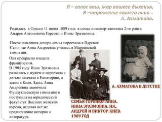 Документ представляет собой биографический очерк о жизни и творчестве Анны Ахматовой, отмечая ключевые события её жизни, такие как брак с Николаем Гумилёвым и личные трагедии, связанные с репрессиями в Советском Союзе. Он также подчеркивает её литературные успехи и признание, включая международные награды и критическое преодоление сетей партийной цензуры. Ахматова продолжала писать стихи до конца жизни, считая их связующим звеном с историей своего народа.