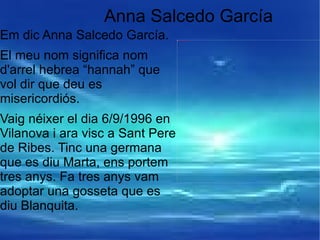 Vaig néixer eldia 6/9/1996 en Vilanova i ara visc a Sant Pere de Ribes. Tinc una germana que es diu Marta, ens portem tres anys. Fa tres anys vam adoptar una gosseta que es diu Blanquita.