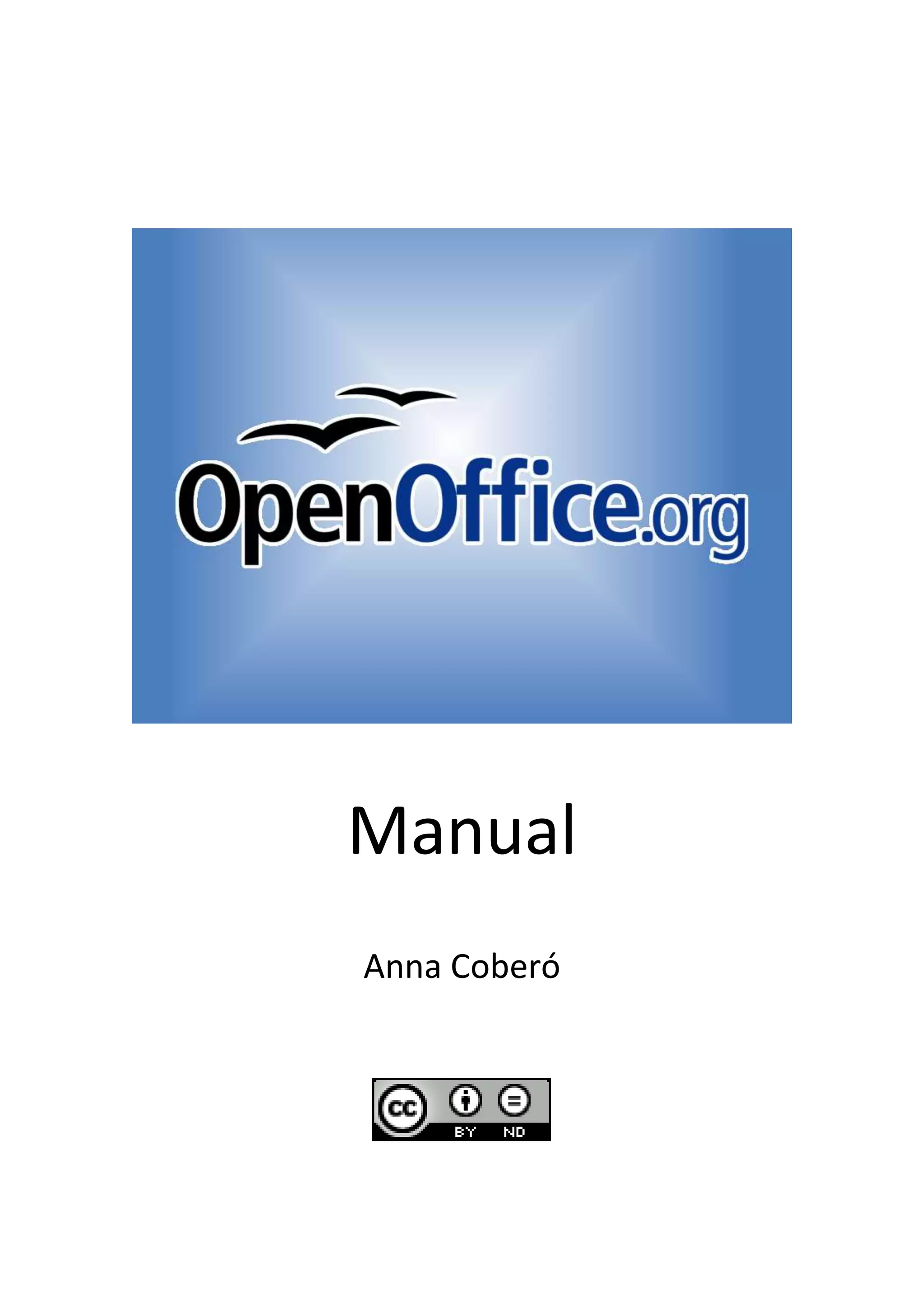 Manual<br />Anna Coberó<br/>Índex<br />Introducció…………………………………………………………..p.1<br />Textos amb OpenOffice……………….……………………….p.1<br />Format de pàgina…………….……………………………………p.2<br />Format de caràcter……………………………………………….p.3<br />Desar document……………………………………………………p.4<br />Introducció<br />L’OpenOffice serveix per a redactar textos, faxos, sobres, cartes o qualsevol tipus de text. També té la possibilitat d'incloure-hi gràfics, notes, marcs, taules, imatges, així com objectes de so, de vídeo, etc.<br />Textos amb OpenOffice.org Writer<br />1-Obrir OpenOffice.org Writer. <br />2-Començar a escriure en el full que apareixerà en la pantalla. <br />3-Un cop omplert el full el programa passarà automàticament al següent. <br />Format de pàgina<br />En el cas de voler canviar el format de la pàgina s'ha de fer els següents passos:<br />1-Anar al menú Format a l'opció Pàgina o bé clicar amb el botó<br />dret a qualsevol punt de la pàgina i triar l'opció Pàgina, aleshores apareixerà una nova finestra amb diferents pestanyes.<br />Organitzador, serveix per escollir el format de la pàgina següent a la seleccionada. <br />A continuació es troba l'anomenada Pàgina que permet canviar el format, l'amplada, l'alçada i l'orientació de la pàgina.<br />La següent, anomenada Fons, determina el fons de la pàgina, que tant pot ser un color concret com una imatge.<br />A continuació hi ha la pestanya Capçalera que permet activar i configurar l'encapçalament.<br />A la pestanya Peu de pàgina hi ha les mateixes opcions que a la anomenada Capçalera, amb la diferència que aquesta el que permet activar i modificar és el peu de pàgina.<br />La següent, anomenada Vores, serveix per definir el tipus de marc que apareixerà a la pàgina.<br />A continuació es troba la pestanya Columnes que tal i com el seu nom indica, permet definir les columnes del document i configurar-les.<br />Finalment hi ha la pestanya Nota al peu en la qual es pot elegir l'alçada i de la línia de separació amb el text.<br />Format del caràcter<br />Cada caràcter pot tenir una configuració diferent.<br />1-Anar al menú Format i triar l'opció Caràcter.<br />2-Seguidament apareixerà una nova finestra amb cinc pestanyes, les quals s'expliquen a continuació:<br />Tipus de lletra, permet elegir qualsevol tipus de lletra dels inclosos dins de l'ordinador. També es pot escollir l'estil, la mida, el color de la lletra i l'idioma. <br />A continuació es troba la pestanya Efectes de lletra. Es pot<br />subratllar, barrar, ombrejar, fer que tots estiguin en majúscules o minúscules, fer que tinguin relleu o que parpellegin.<br />La següent pestanya, anomenada Posició, permet determinar si el caràcter és un superíndex (que està situat a la part<br /> superior), o un subíndex (situat a la part inferior). <br />La pestanya Hiperenllaç serveix per a incloure hiperenllaços en els text, només cal seleccionar el destí a l'apartat URL, i posar-li un nom.<br />Finalment hi ha la pestanya Fons, es pot elegir el color de fons del caràcter, també es pot fer a través de l'opció color de fons de la barra d'objectes.<br />Desar documents<br />Un cop finalitzat el document, es pot desar a través de:<br />1-Menú Fitxer. <br />2-Opció Desa o l'opció Anomena i desa.<br />3-Clicar guardar.<br />