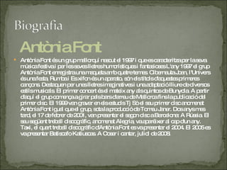 Antònia Font AntòniaFont és un grup mallorquí nascut el 1997 i que es caracteritza per la seva música festiva i per les seves lletres humorístiques i fantasioses L'any 1997 el grup Antònia Font enregistra una maqueta amb quatre temes. Cibernauta Joan, l'Univers és una festa, Rumba i Es xifon és un aparato, són els títols d'aquestes primeres cançons. Destaquen per unes lletres imaginatives i una adaptació lliure de diversos estils musicals. El primer concert és el mateix any als quintos de Bunyola. A partir d'aquí el grup comença a girar pels bars d'arreu de Mallorca fins la publicació del primer disc. El 1999 van gravar en els estudis Tj Sò el seu primer disc anomenat Antònia Font igual que el grup, sota la producció de Tomeu Janer. Dos anys mes tard, el 17 de febrer de 2001, van presentar el segon disc a Barcelona: A Rússia. El seu següent treball discogràfic, anomenat Alegria, va aparèixer al cap d'un any. Taxi, el quart treball discogràfic d'Antònia Font es va presentar el 2004. El 2005 es va presentar Batiscafo Katiuscas. A Coser i cantar, juliol de 2008.