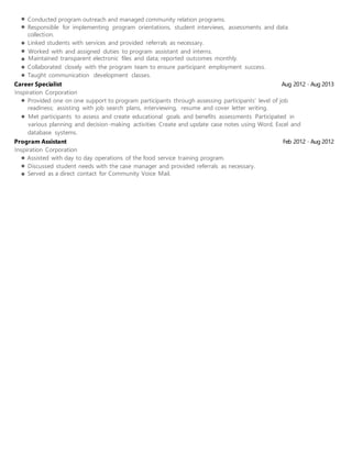 Anna Wilson is seeking a position that offers new challenges and opportunities for professional development and advancement. She has over 5 years of experience in case management, outreach, and advocacy. Her skills include effective problem solving, crisis intervention, harm reduction, housing first models, and proficiency with client data systems. Her work history includes positions as a case manager providing housing support services, residential aide, youth engagement worker, case manager for an education program, career specialist, and program assistant for a food service training program.