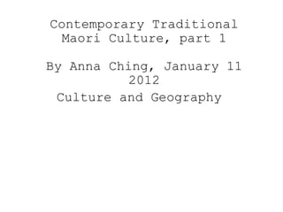 The document discusses key aspects of contemporary traditional Maori culture in New Zealand. It notes that the Maori are the indigenous people of New Zealand, located in the South Pacific off Australia. It describes some Maori as living traditionally while others live modern lives. Two traditions mentioned are the Haka war dance and Ta moko tattooing and body painting. However, it also notes that like other indigenous peoples, many Maori struggle with issues such as poverty, alcoholism, and drug abuse.