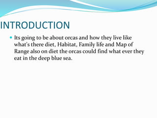 Orcas live in coastal waters between 54 and 75 degrees Fahrenheit and can be found all over the world. They live in family groups called pods and hunt cooperatively, with female orcas teaching younger generations how to hunt. Orcas eat a wide variety of prey including seals, squid, octopus, fish, and other marine animals.