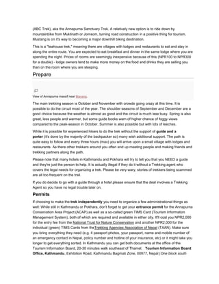 The Annapurna Circuit is a 17-21 day trek through Nepal considered one of the best in the world. It passes through four regions with distinct scenery and cultures: Lamjung and Myagdi in the lower elevations dominated by Hinduism and farming, and Manang and Mustang at higher elevations dominated by Tibetan Buddhism. The trek goes counter-clockwise from Besisahar to Nayapul, reaching its highest point at Thorung La pass at 5,416 meters. Along the way it offers stunning views of the Annapurna, Dhaulagiri, and other Himalayan mountain ranges. Logistics like permits, accommodations, supplies and transportation are discussed to help