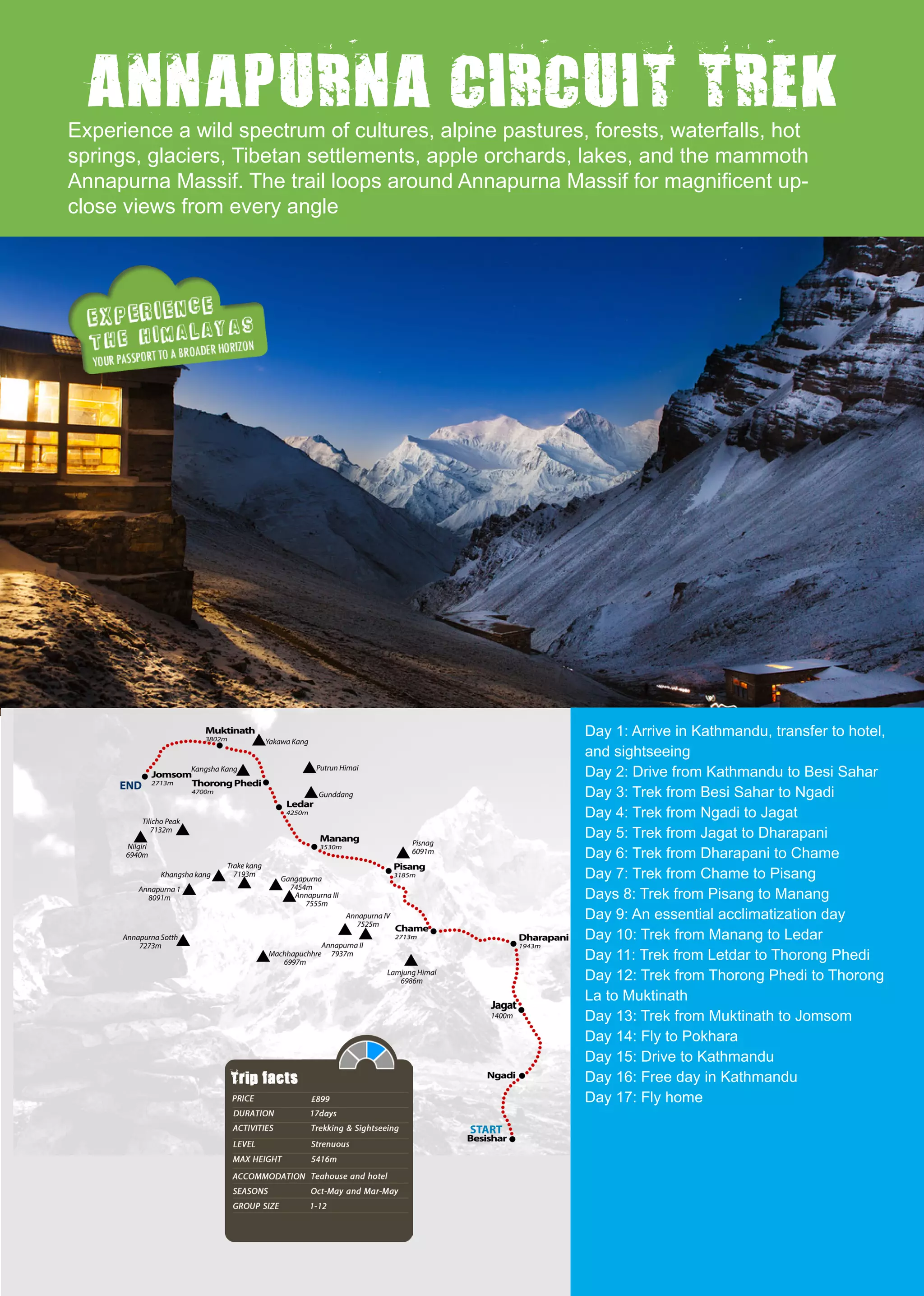 The Annapurna Circuit Trek offers a diverse cultural and scenic experience as it loops around the majestic Annapurna massif, showcasing alpine pastures, forests, and Tibetan villages. The trek spans 17 days, beginning in Kathmandu and concluding with a flight from Jomsom to Pokhara, with significant highlights including the challenging Thorong La Pass and various natural hot springs. Accommodation is primarily in local teahouses, providing opportunities for cultural immersion, and preparation includes discussions on altitude acclimatization and equipment recommendations.