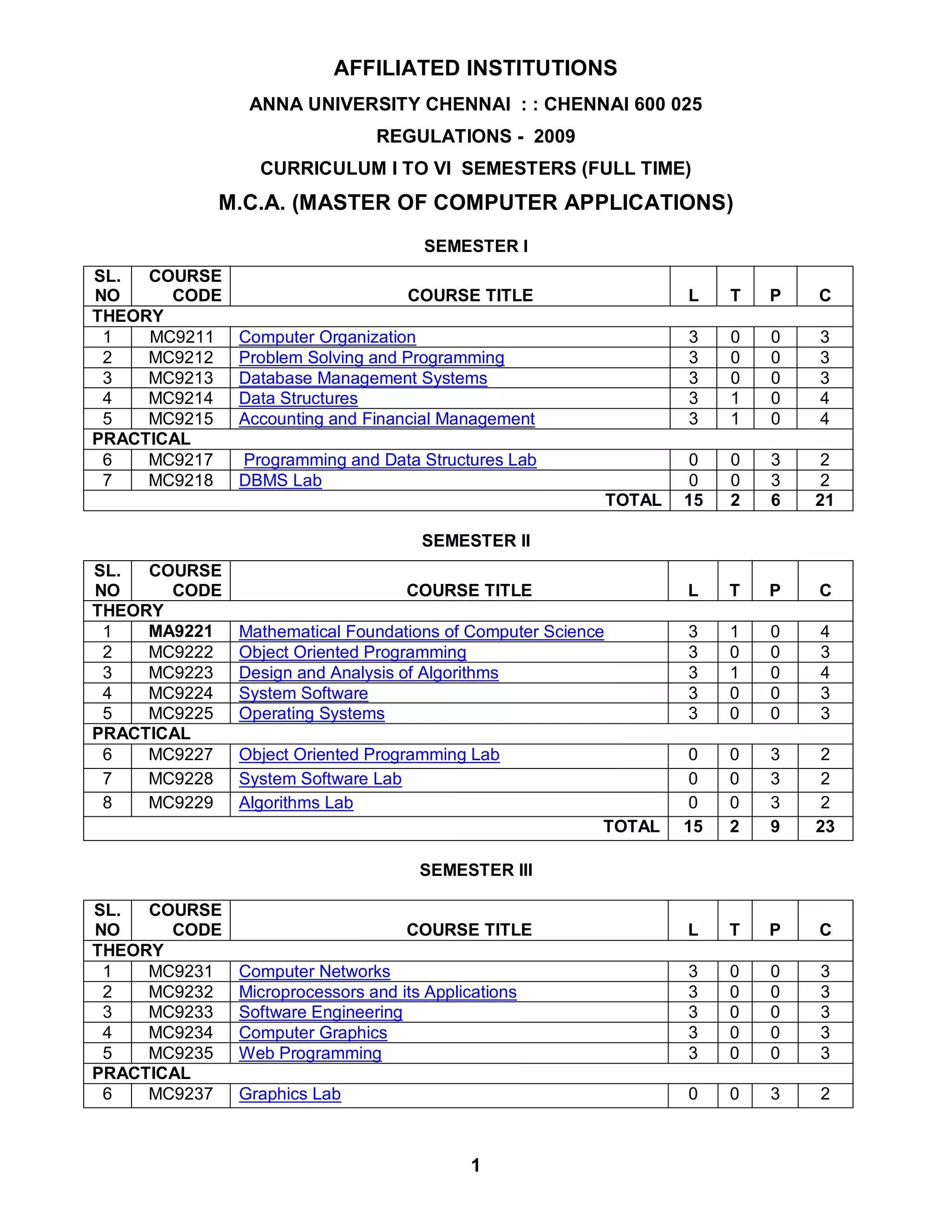 This document outlines the curriculum for the Master of Computer Applications (MCA) program over six semesters. It includes: