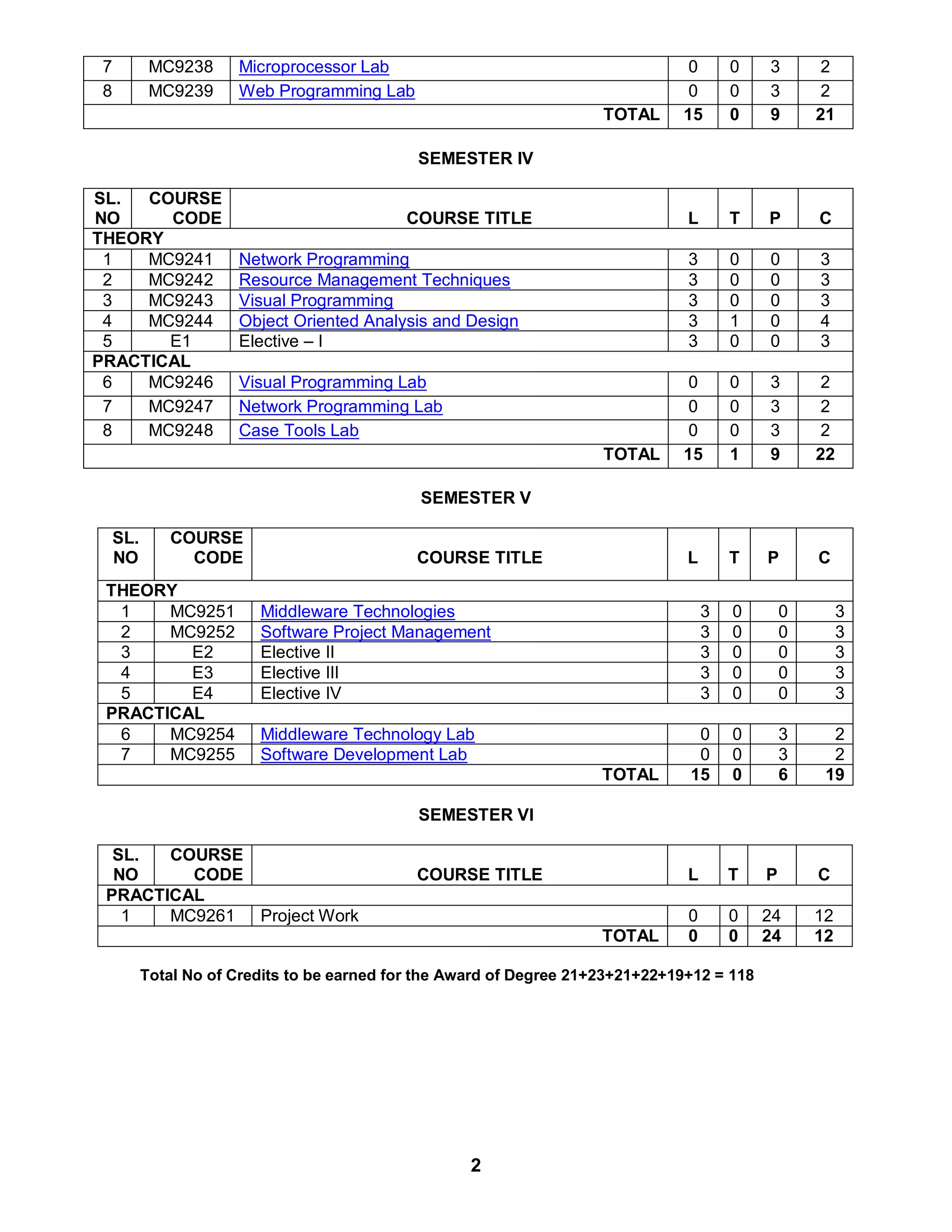 - The total number of credits required for award of the MCA degree is 118.