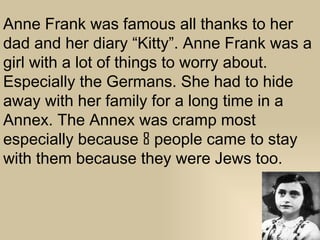 Anne Frank was a Jewish girl who lived in Germany and the Netherlands during World War II. To hide from the Nazis, Anne and her family went into hiding in a secret annex in Amsterdam for over two years. Anne chronicled her experiences in her diary during this time. She was eventually captured and sent to a concentration camp, where she died at age 15. After the war, Anne's father Otto published her diary to share her story with the world.