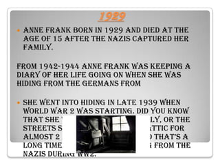 Anne Frank was born in 1929 in Germany and died in 1945 at the age of 15 after being captured by the Nazis while hiding from them in an attic in Amsterdam. From 1942-1944, she kept a diary documenting her experiences in hiding. She went into hiding in late 1939 at the start of World War 2 and remained hidden for over two years in the secret annex of her father Otto Frank's business building. In 1945, Anne and her family were captured and transported to concentration camps, where they died or were killed. Her diary was published in 1947 and became widely read, documenting her life in hiding during the Holocaust.