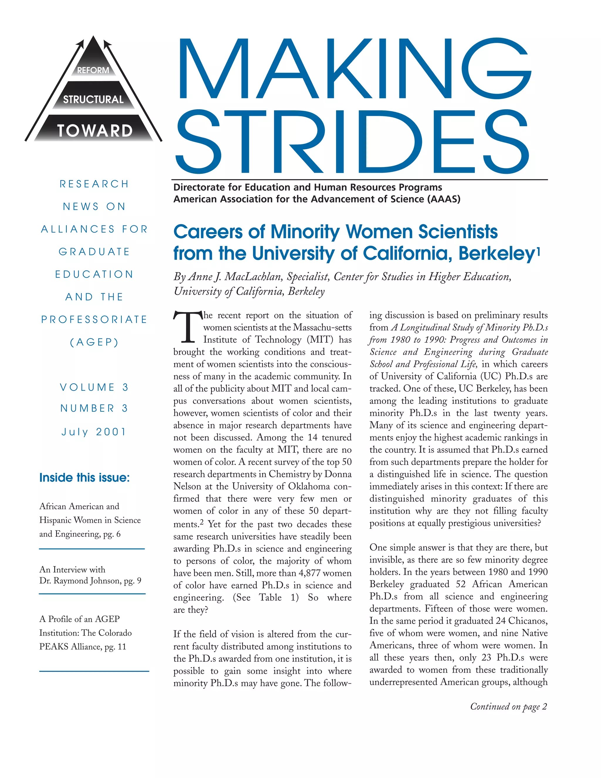 This document summarizes a study on the careers of minority women who earned PhDs in science and engineering from the University of California, Berkeley between 1980-1990. It finds that: