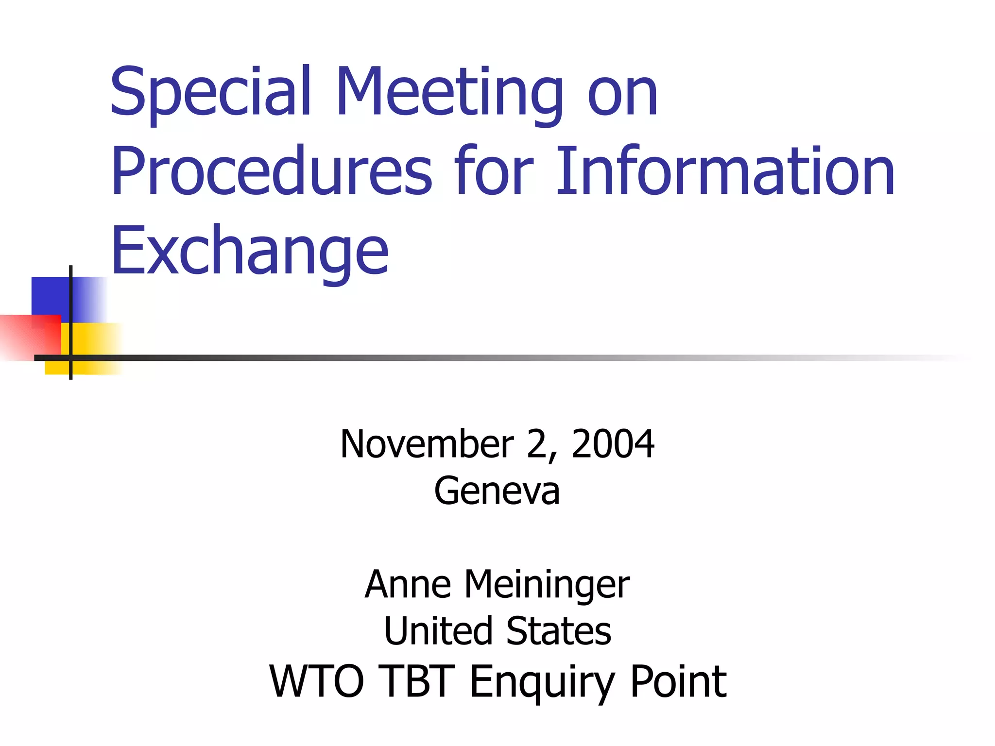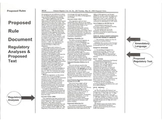 The document summarizes procedures for information exchange regarding regulations in the United States. It outlines the notice and comment process where federal agencies issue notices of proposed regulations, accept public comments, and publish final rules addressing the comments. It also describes the U.S. Federal Register as the main source for finding these notices and rules, and an electronic tool called RegAlert that tracks regulations in U.S. states.