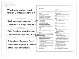 The document summarizes procedures for information exchange regarding regulations in the United States. It outlines the notice and comment process where federal agencies issue notices of proposed regulations, accept public comments, and publish final rules addressing the comments. It also describes the U.S. Federal Register as the main source for finding these notices and rules, and an electronic tool called RegAlert that tracks regulations in U.S. states.