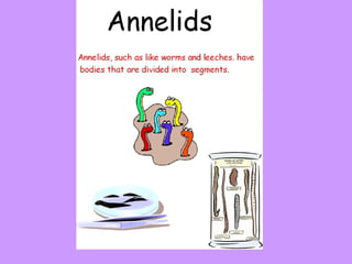 Annelid worms have bilateral symmetry and segmented bodies made of repeating parts. There are three main classes: earthworms, bristle worms, and leeches. They obtain food through scavenging, predation, or parasitism and can reproduce both sexually and asexually. Annelids live in saltwater, freshwater, or on land. They move via muscle systems and bristles, and have circulatory and nervous systems.