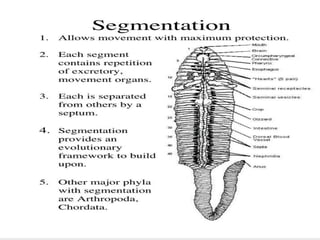 2. Annelids are classified into 3 main groups: Polychaetes, which show the most variation; Oligochaetes like earthworms, which are simpler in structure; and Hirudinea or leeches, which are uniform in appearance and lack appendages.