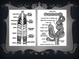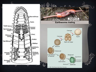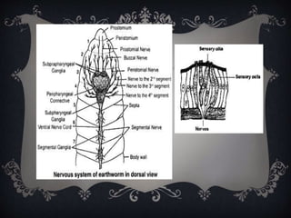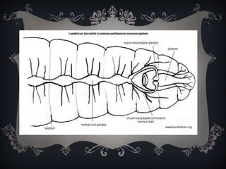 The document discusses the phylum Annelida. It covers their introduction, unique characters, general characters, morphology and anatomy, classification, harmful effects, and benefits. Annelida are segmented worms with a coelom, metameric segmentation, and cephalization. They exhibit homonomous metamerism and have three main body regions. Their anatomy includes systems like integumentary, digestive, circulatory, excretory, nervous, and reproductive. They are classified into classes like Polychaeta, Hirudinea, and Oligochaeta.