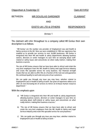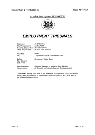 The document summarizes a judgment from an employment tribunal case between Mr. Douglas Gardiner as claimant and Exsto UK Ltd and others as respondents. It discusses the allegations made in the case regarding constructive unfair dismissal, race discrimination, disability discrimination, and unpaid wages. It finds that while some of the claimant's longstanding complaints predated the key issues, the respondent company's actions from December 2010 did amount to a fundamental breach of contract justifying the claimant's resignation. However, it also notes that the company later made some deductions from the claimant's salary in an attempt to undermine his claims, which were not part of the original issues and aggravated the situation.