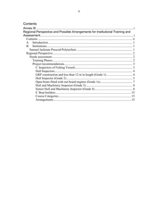 The document provides a comprehensive assessment of institutional training and assessment needs for inspectors and builders of small fishing vessels in the Eastern Caribbean. It highlights existing educational institutions, training phases, project recommendations, and specific qualifications for different grades of vessel inspectors and boatbuilders. Additionally, it emphasizes the necessity of tailored training programs and the importance of evaluating current staff qualifications to ensure compliance with new regional standards in vessel construction and inspection.