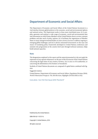 The 2014 revision of World Urbanization Prospects by the United Nations indicates that 54% of the global population lives in urban areas, a figure expected to rise to 66% by 2050, particularly driven by rapid urbanization in Asia and Africa. Key countries, including India, China, and Nigeria, will account for a significant portion of this growth while many urban areas face challenges due to unplanned expansion and inequality. The report emphasizes the need for integrated policies that address the complexities of urban development and the urgency for sustainable solutions in an increasingly urbanized world.