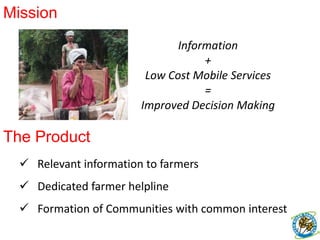IKSL provides low-cost mobile services to empower rural farmers in India with relevant information. It uses push technologies like voice messages and pull technologies like helplines to deliver agricultural information from sources like IFFCO and universities to farmers. It partners with organizations like Commonwealth of Learning to develop content. Success stories show how individual farmers and women's groups have improved incomes and living standards by implementing the information received from IKSL. Surveys found over 70% of farmers find the messages useful and more than half depend on IKSL as their sole information source. In 2010-11, IKSL reached over 4 million customers across 18 states and 10 languages.