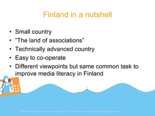 The Finnish Society on Media Education (FSME) is a non-profit organization established in 2005 to support research and practices around media education in Finland. It is funded by the Ministry of Culture and Education and works nationally and internationally to share experiences through conferences and online resources. FSME coordinates events, provides informational materials through its website and newsletters, and brings together its community and partner organizations to advance media literacy in Finland.