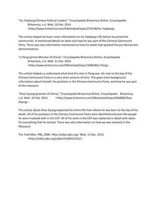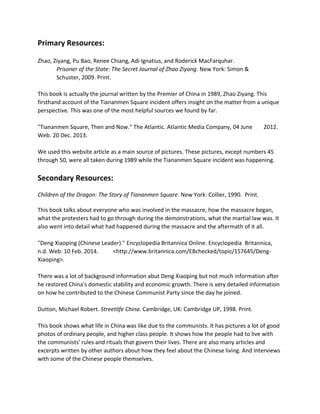 This document provides summaries of several primary and secondary sources about the Tiananmen Square protests and massacre in 1989. The primary sources included Zhao Ziyang's secret journal offering an insider perspective and photographs from The Atlantic. Secondary sources included books providing context on the events and individuals involved, as well as encyclopedia entries on key Chinese leaders like Deng Xiaoping, Hu Yaobang, Li Peng and Zhao Ziyang. A PBS video on the iconic "Tank Man" image was also referenced.
