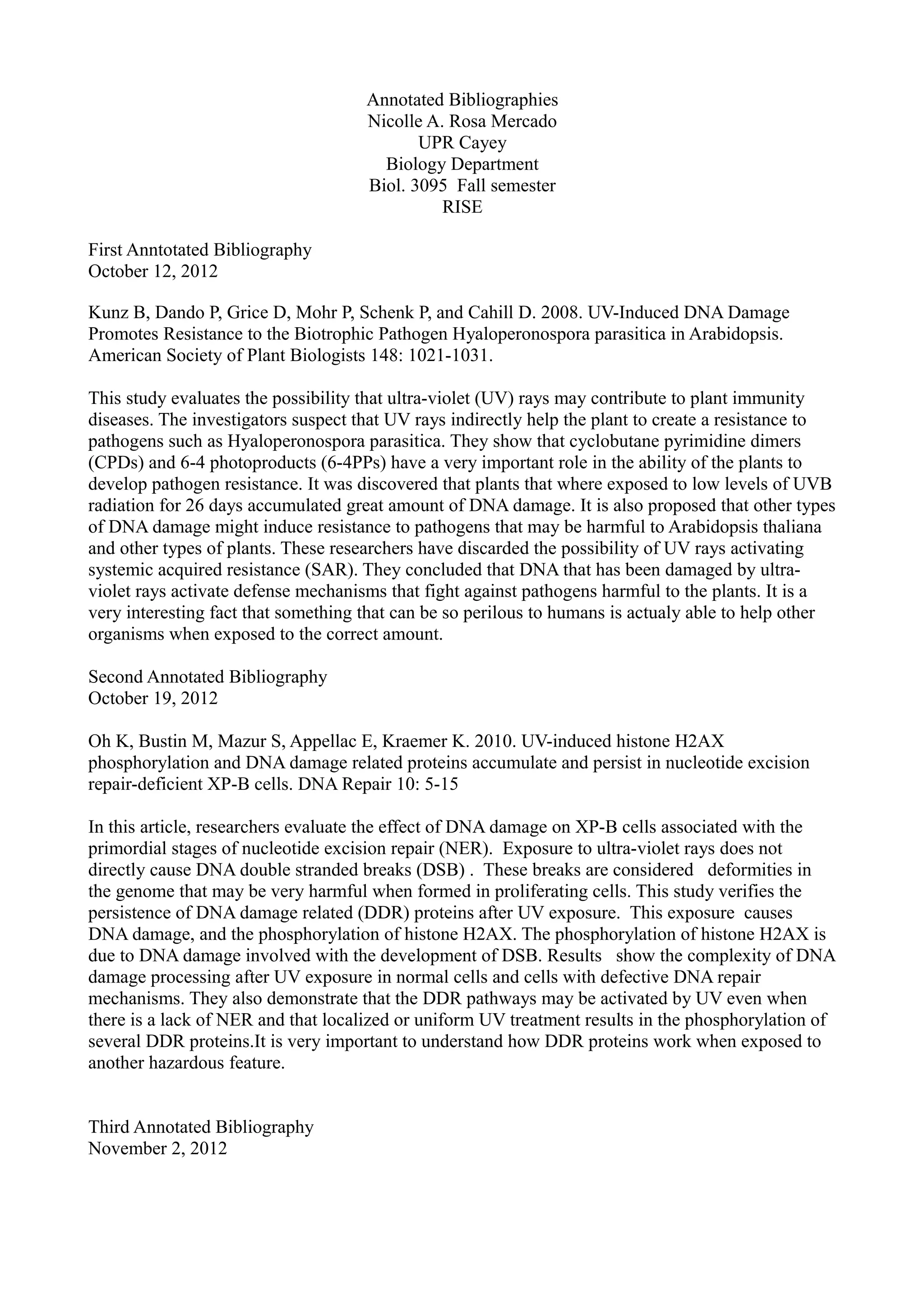 1) The document discusses three annotated bibliographies about research on the effects of UV radiation on DNA and plant/human cells.
