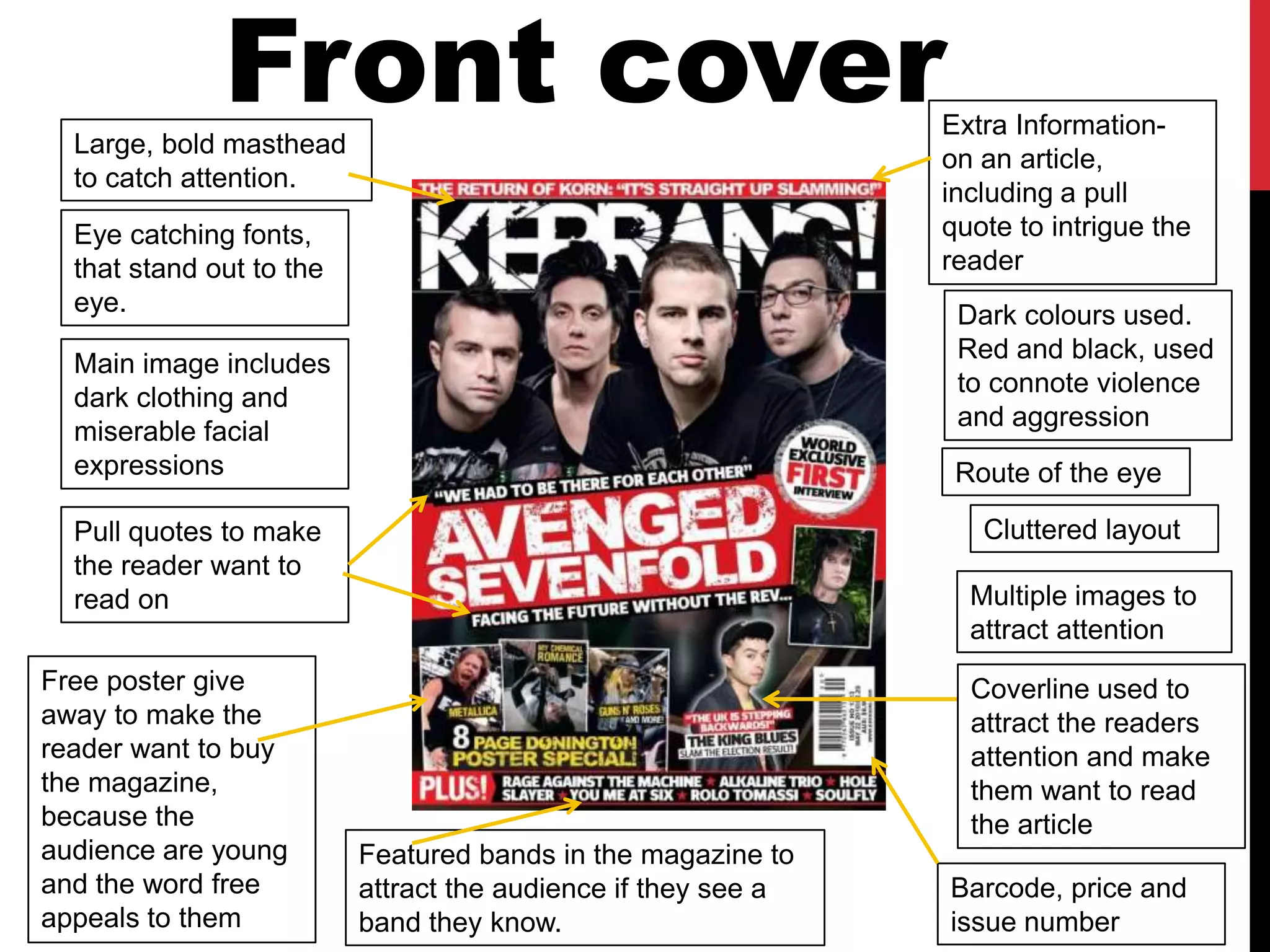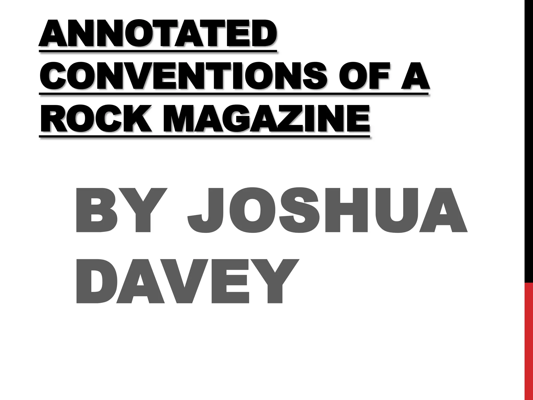 The document summarizes conventions used in rock magazine layout and design. It discusses elements like using eye-catching fonts and images on the cover to attract attention. The inside pages also use visual elements like pull quotes and multiple images to engage readers and route their eyes through the page. Color schemes, consistent layouts, and featuring popular bands are used to develop recognizability and appeal to the target audience.