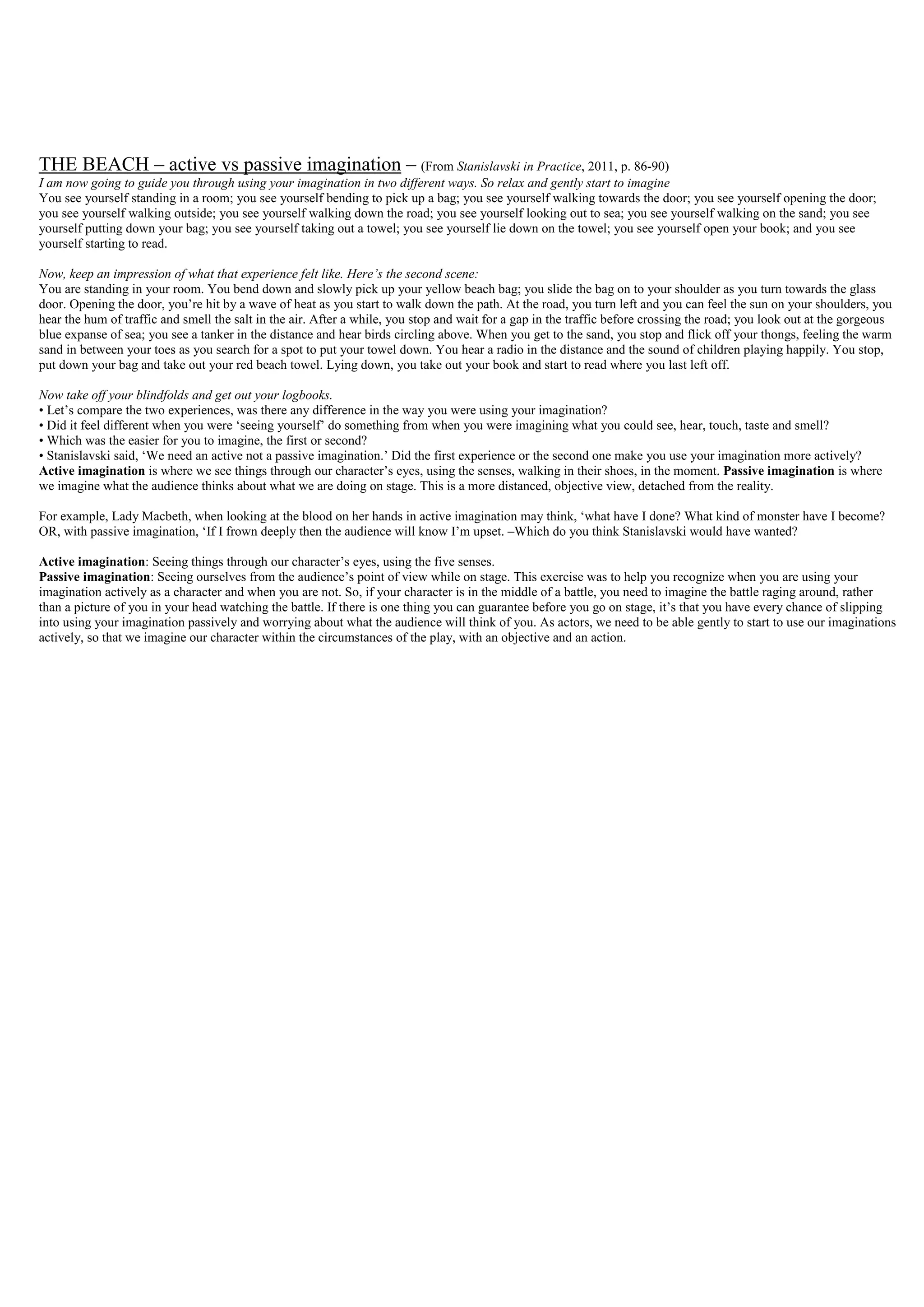 This document outlines a drama lesson plan focused on introducing students to Stanislavski's concept of theatrical realism. The lesson begins with providing context on realism and Stanislavski's goal of truthful acting. Students then participate in sensory exercises using music and smells to engage their imagination and recall memories in order to experience characters through their senses, as Stanislavski advocated. Next, students read passages demonstrating active versus passive imagination and discuss the difference, with active imagination seen as more truthful. The lesson aims to help students understand realism and how Stanislavski's techniques can aid in truthful performance through engaging the senses and active imagination.