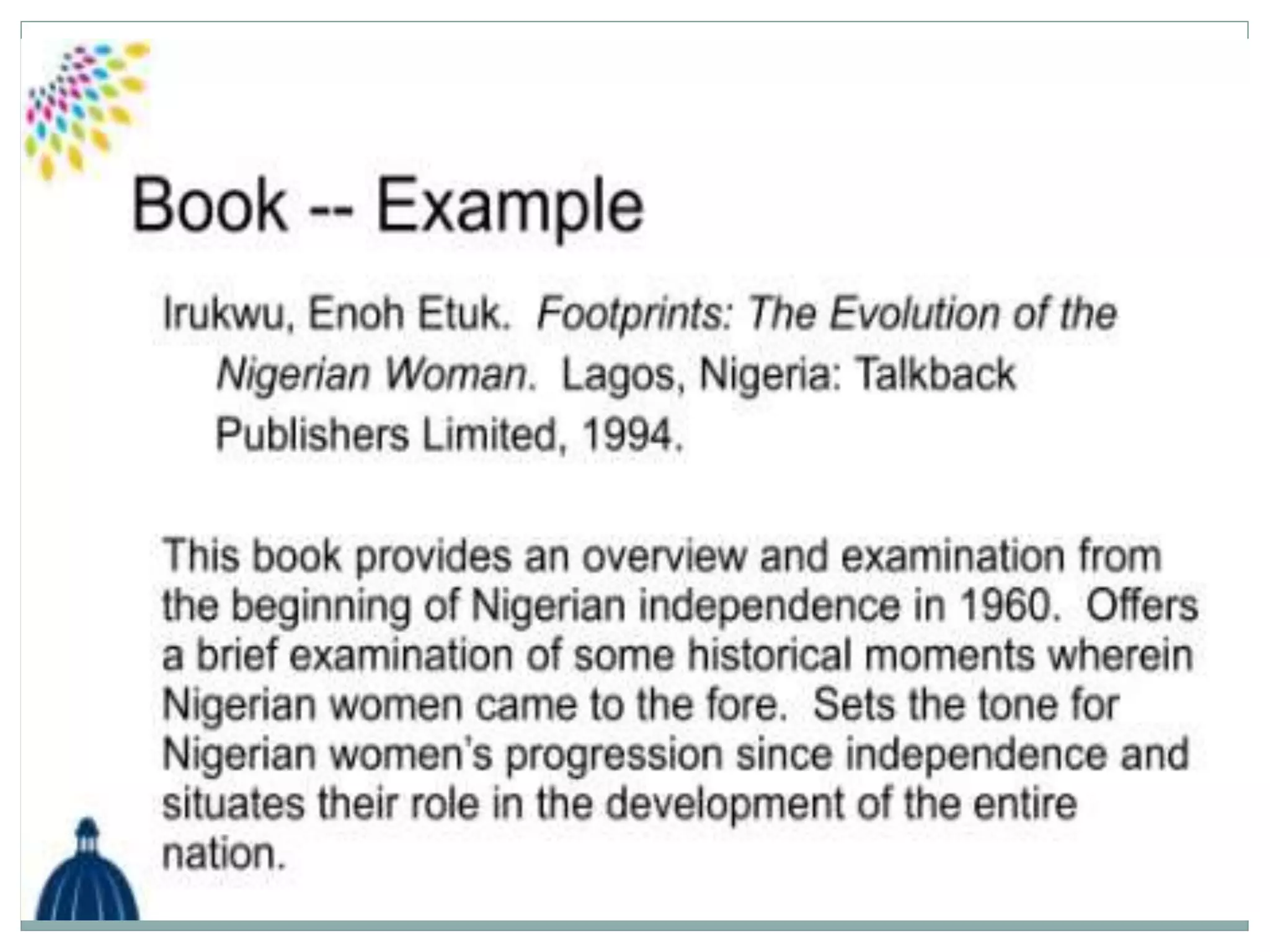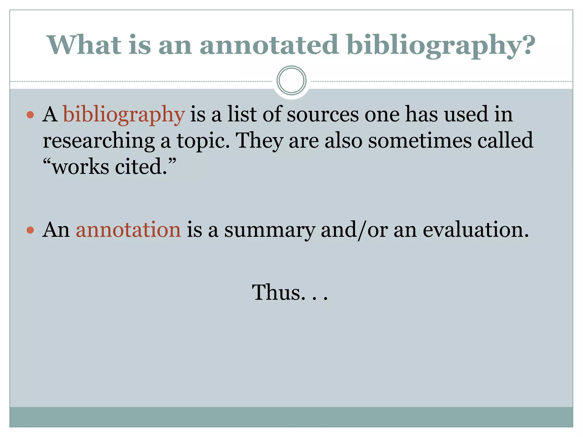 This document provides guidance on what constitutes an annotated bibliography and how to write effective annotations. It defines an annotated bibliography as a list of citations followed by descriptive and evaluative paragraphs about each source. The annotations should summarize the source, assess its usefulness and reliability, and reflect on how it fits into and supports the researcher's work. The document outlines the key components an annotation should include and provides examples of formatting and structuring an annotated bibliography.