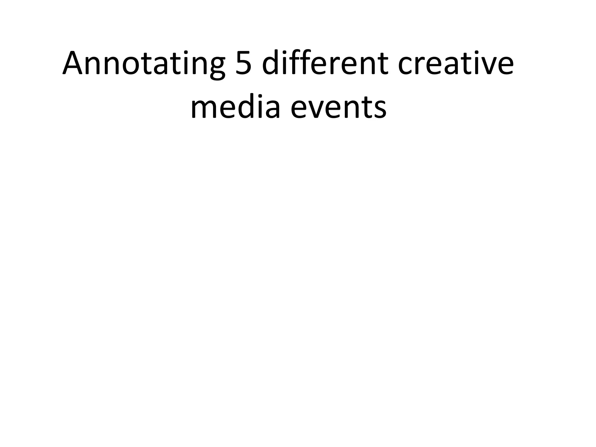 The document annotates 5 creative media events created by students: 1) A presentation about murals created in school music practice rooms. 2) A performance art piece about a female prison. 3) Murals created for the music practice rooms to inspire children with music. 4) A festival in Cranford organized by the creative media team. 5) Students made carnival costumes and participated in a school parade as part of their qualification.