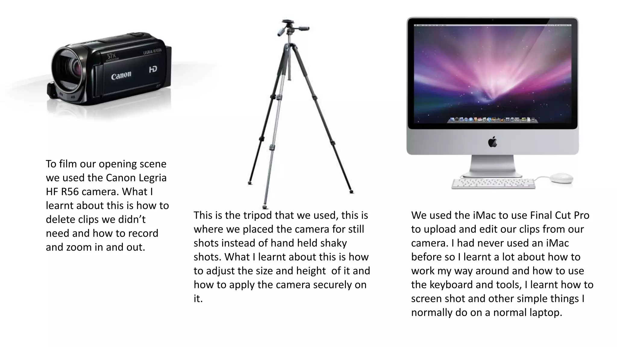 The document discusses the production of an opening scene for a film. It describes using a Canon Legria HF R56 camera to record clips and zoom, and a tripod to secure the camera for stable shots. Final Cut Pro was used on an iMac to edit clips by uploading, screening, and using tools. Effects, transitions, sound layers, and titles were added using the software. Various online resources and programs were utilized in the project.