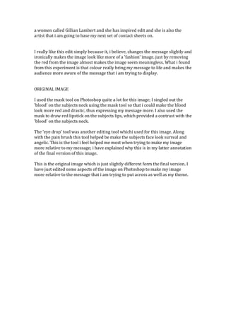 This document discusses the concept, composition, angle, and editing of a photographic image intended to connect the audience to the subject and make them feel compassion. The medium-close up portrait shows the subject's head turned downwards to appear defeated. Bars of a cage frame the subject and add to the effect while the angle allows viewers to empathize. Editing in black and white removed color and changed the message to seem more meaningless. Mask and eye drop tools were used to emphasize red details like blood and lips to contrast with the surreal, angelic face and further the message relating to animal skinning.