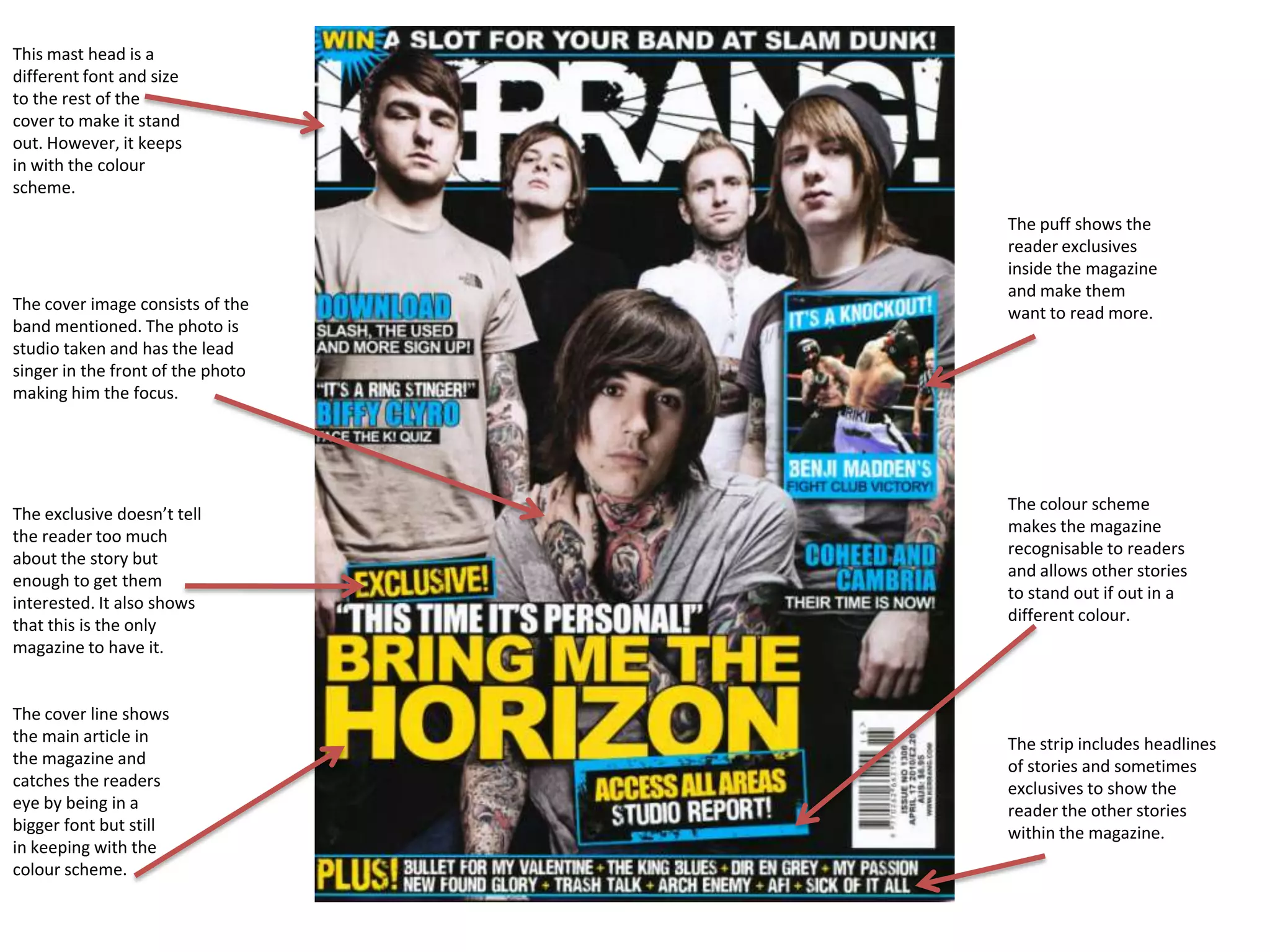 The document provides information on magazine layout and design. It discusses how different design elements like mastheads, cover images, and article previews are used to catch readers' attention and showcase key stories. Color schemes and font sizes are employed to make important features stand out while complementing the overall style. The goal is to entice readers through visuals and teasers before they dive into the full articles inside.