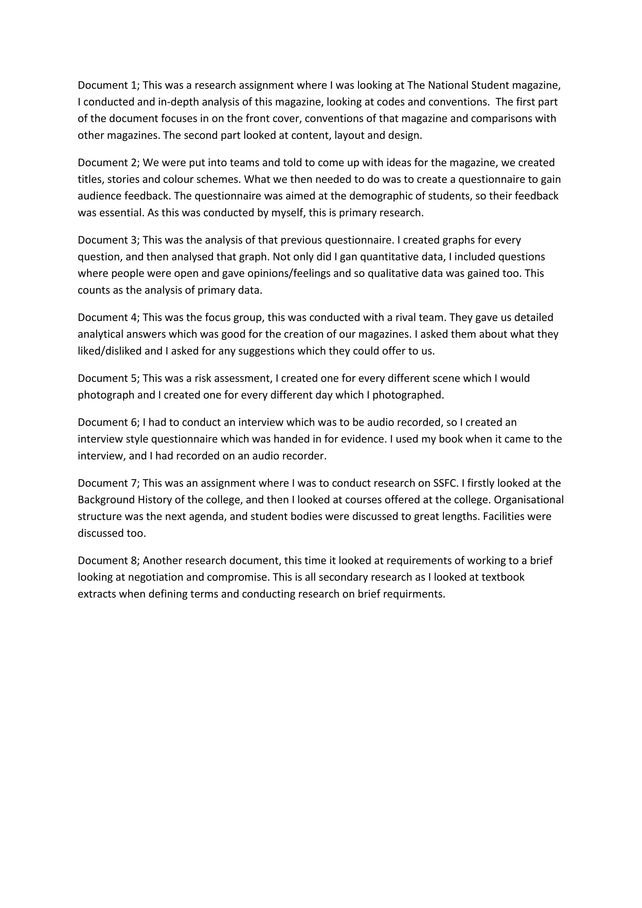 Document 2 describes developing ideas, titles and color schemes for a student magazine, then creating and distributing a questionnaire to gain student audience feedback.