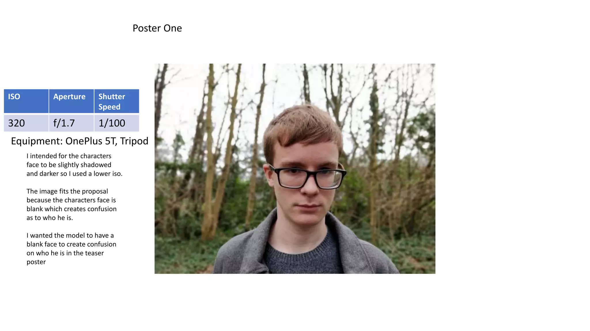 The document discusses three photos taken for posters. The first used a lower ISO to make the character's face darker and create confusion about their identity. The second used a higher ISO to make the character brighter and show they are worried about being chased by police. The third used a high aperture to make the image lighter while keeping the character's face hidden to continue the theme of hiding, conveying they are on the run from police. All photos were taken with a OnePlus 5T phone on a tripod.